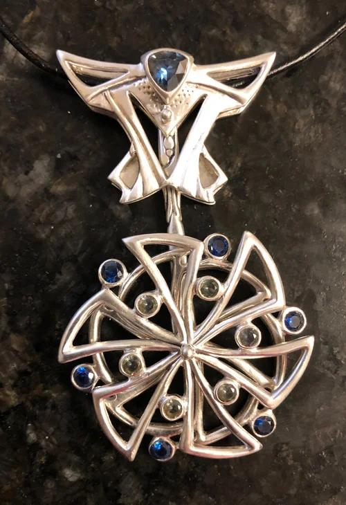 During the summer of 2019 I hand-carved this kinetic wearable sculpture. It has 13 gemstones and is made of a mix of silver metal clays.
